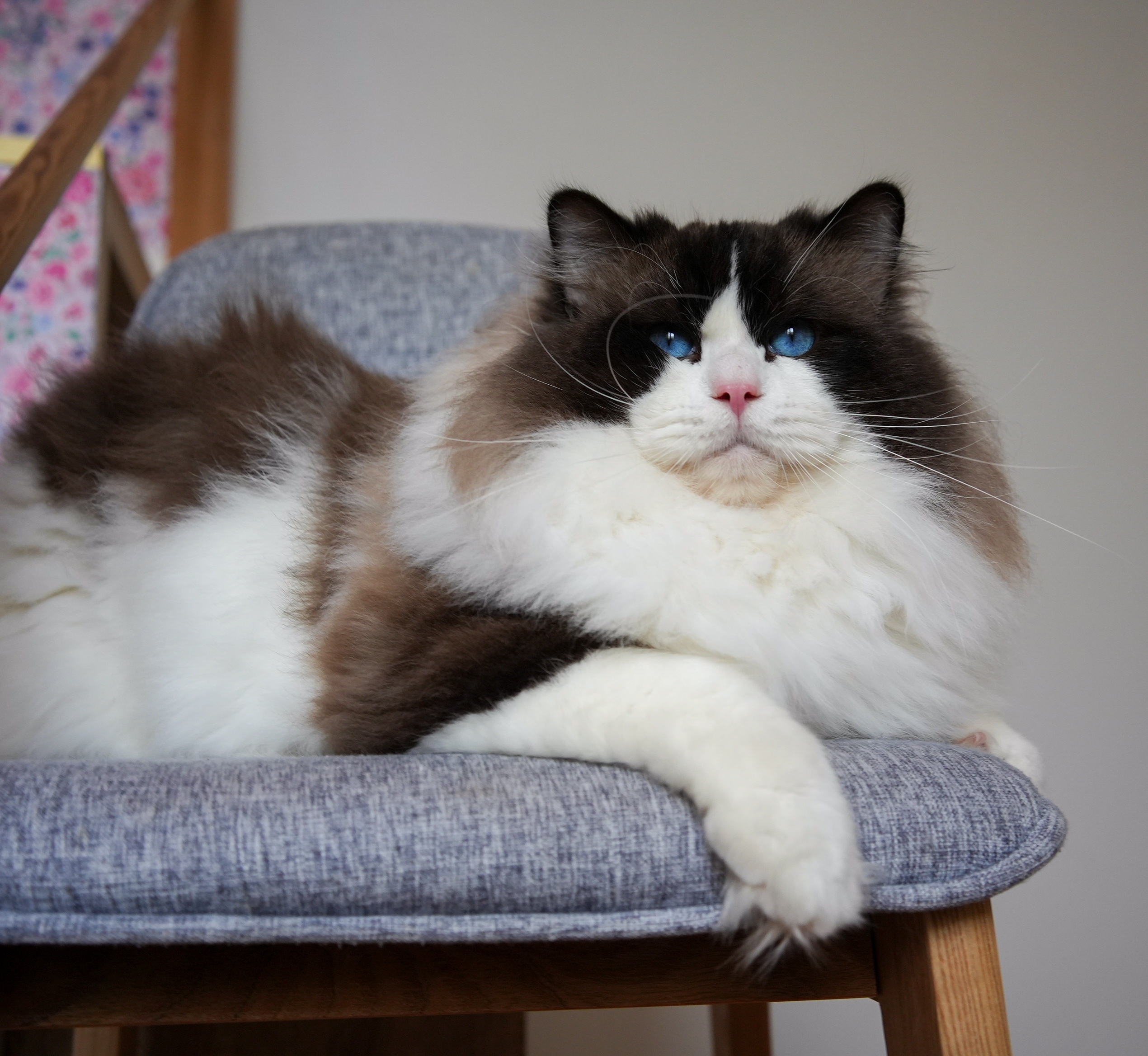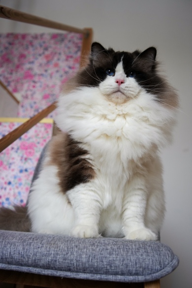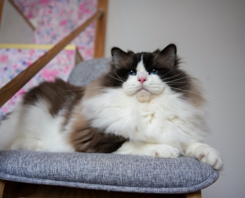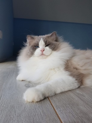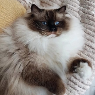 To w prawdzie bardzo młody kociak ale swoim wyglądem przypomina już dorosłego ragdolla . Aktualnie w wieku półtora roku waży 8,5 kg i jest niesamowicie przyjaznym misiem i królem naszego domu :) . Charakter ma jak marzenie ! Coś na co zwracam szczególną uwagę przy wyborze rodziców moich kociąt . I skittles to taki strzał w dziesiątkę ! Uwielbia głaskanie po brzuszku , spędzanie wielu godzin na kolanach , klatce piersiowej ( ledwo mogę złapać oddech ) . Domaga się pieszczot piszcząc jak małe kocie . W kontakcie z innymi kotami jest dobrym kumplem = ale inne kocury są dla niego konkurencją ;)